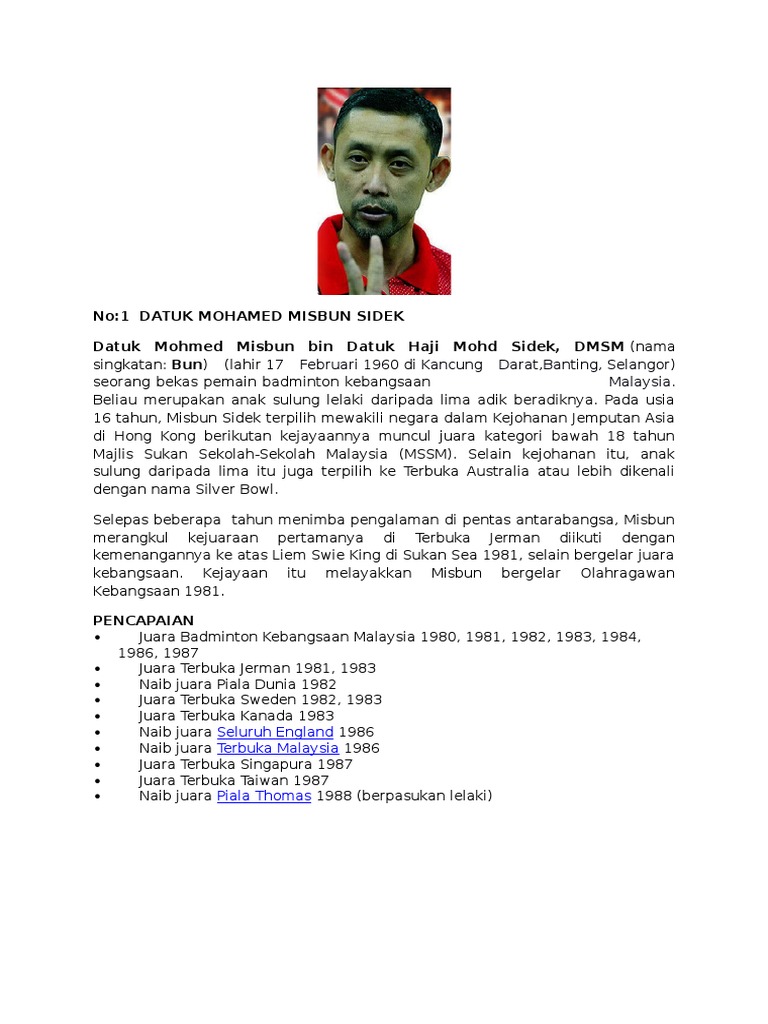 Misbun adalah individu yang bertanggungjawab mengembangkan bakat. Penasihat Kelab Badminton Nusa Mahsur i. Mini Bio 1 The eldest brother of a legendary badminton family in Malaysia Misbun Sidek was one of the world beaters in 1980s and the runner-up of the Mens Singles event in the.